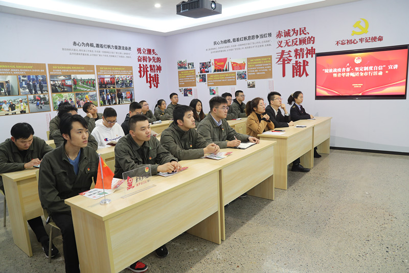 本次活动还特邀靖江市"东线第一帆"青年讲师团成员围绕"绽放战役青春·坚定制度自信"、学习贯彻党的十九届五中全会精神两大主题进行宣讲,更加坚定了国信青年永远跟党走、积极工作战胜疫情迈向社会主义新时代的信心。活动最后,青年团员们在"千帆竞发"主题广场上庄严列队,面向团旗,重温入团誓词,以新的精神面貌再出发。