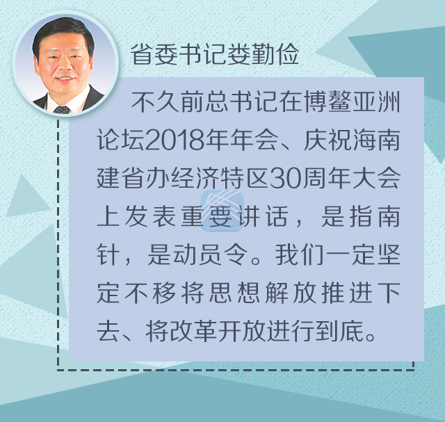 娄勤俭在讲话中指出,党的十八大以来,以习近平同志为核心的党中央高举中国特色社会主义伟大旗帜,积极回应时代关切,勇于破解实践难题,以非凡的政治勇气和高超的政治智慧推动新一轮改革开放大潮涌起。特别是不久前总书记在博鳌亚洲论坛2018年年会、庆祝海南建省办经济特区30周年大会上发表重要讲话,是新形势下解放思想再深化的指南针,是新时代改革开放再出发的动员令。我们一定要全面深入学习领会,深刻掌握精髓要义,自觉运用这一有力的思想武器,坚定不移将思想解放推进下去、将改革开放进行到底。