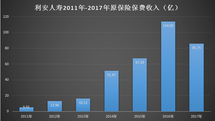 再来看利安人寿今年来原保险保费收入情况,上半年,利安人寿实现90.23亿元原保险保费收入,同比增长32.13%。原保费大幅度增长的背后,是利安人寿去年原保险保费收入的大幅下挫,2017年全年,利安人寿实现85.75亿元原保险保费收入,较2016年同比缩减24.8%,这是利安人寿自成立以来首度出现原保险保费收入下滑的现象,其中寿险业务跌幅最为严重,同比下滑26%。